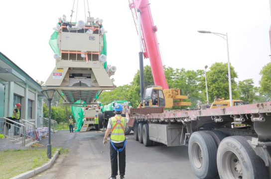 面對工期緊張、作業(yè)空間受限等挑戰(zhàn),濱海供水公司成立專班工作組,聯(lián)合設(shè)備供應(yīng)商,通過提升專家論證層級、邀請區(qū)級大型建筑行業(yè)專家優(yōu)化吊裝方案、并開展多輪現(xiàn)場踏勘,最終確定創(chuàng)新采用400噸級重型吊機(jī),吊裝高度達(dá)21米。作業(yè)現(xiàn)場,施工團(tuán)隊(duì)精準(zhǔn)測算設(shè)備進(jìn)場路徑及吊臂旋轉(zhuǎn)半徑,實(shí)現(xiàn)單臺設(shè)備2小時(shí)快速定位,安全高效完成吊裝作業(yè)。