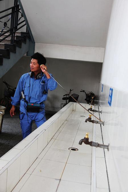 圖為供水公司聽漏人員對學校供水管道進行聽漏