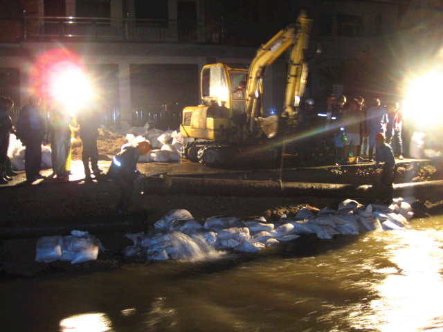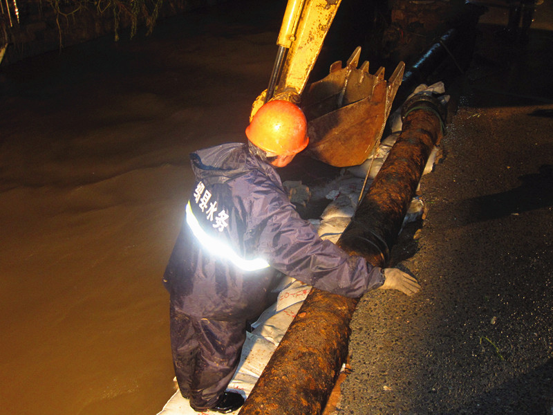 災(zāi)情就是命令!集團(tuán)接到縣防指命令后,立即啟動(dòng)大口徑管道應(yīng)急搶修預(yù)案。根據(jù)受災(zāi)情況,集團(tuán)迅速派出由20多名人員組成的專業(yè)搶修隊(duì)伍,隨帶各種專業(yè)搶修工具,冒著大雨趕赴受災(zāi)點(diǎn),并于下午16時(shí)進(jìn)入現(xiàn)場(chǎng)開(kāi)始搶修。經(jīng)過(guò)8個(gè)小時(shí)的持續(xù)作戰(zhàn),搶修隊(duì)克服重重困難,終于搶通供水管道。然而,凌晨3點(diǎn)多,敖紅了雙眼的搶修人員卻再次接到任務(wù),立即趕赴王壇鎮(zhèn)幫助王壇鎮(zhèn)水廠解決因停電造成管網(wǎng)無(wú)法輸水的問(wèn)題,于凌晨5點(diǎn)恢復(fù)供水。