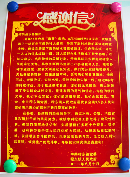 8月17日,中共稽東鎮(zhèn)黨委、稽東鎮(zhèn)人民政府專程為集團送來感謝信和錦旗,衷心感謝集團在第11號臺風“海葵”期間,發(fā)揚艱苦奮斗、無私奉獻精神,第一時間成功搶修被毀壞的輸水總管,保障了該鎮(zhèn)人民群眾的飲水安全。