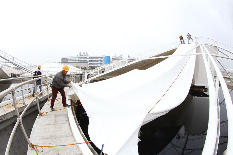 日前,江濱水處理公司20萬噸/日集中預(yù)處理二期工程污泥濃縮池進入鋼結(jié)構(gòu)膜安裝階段,預(yù)計于本月底基本完成。該除臭系統(tǒng)由8個鋼結(jié)構(gòu)反吊膜裝置及2個生物除臭裝置組成,為公司第四批建設(shè)的除臭項目。至此,公司在臭氣治理上已累計投入2000余萬元,目前廠區(qū)內(nèi)高、中濃度臭氣基本實現(xiàn)全收集、全治理,為實現(xiàn)“生態(tài)江濱”目標打下了堅實基礎(chǔ)。