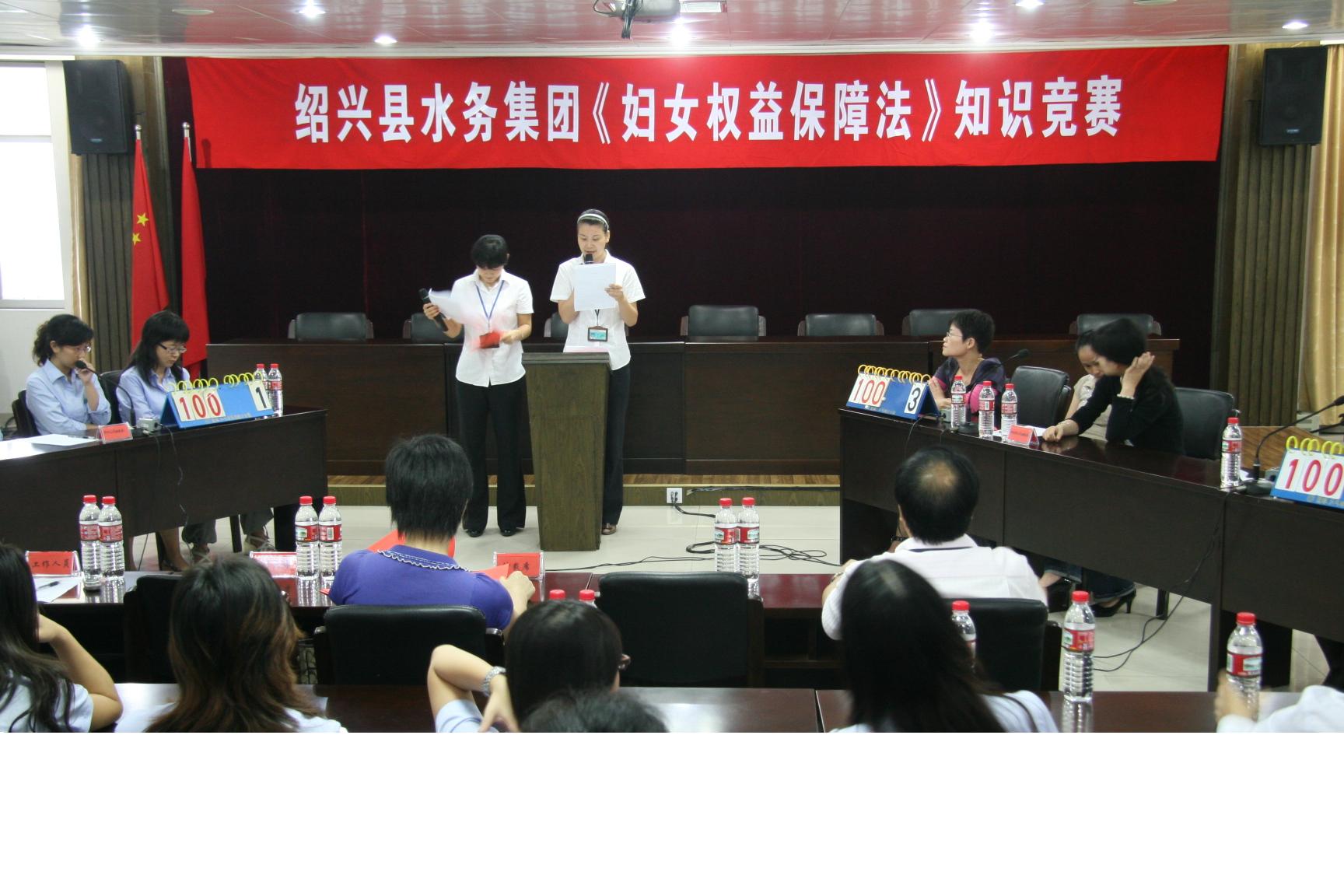 為廣泛深入地學(xué)習(xí)、宣傳、貫徹《中華人民共和國婦女權(quán)益保障法》,提高廣大女職工的法律意識及依法維護(hù)自身利益的能力,在“十一”前夕,水務(wù)集團(tuán)婦聯(lián)舉辦《中華人民共和國婦女權(quán)益保障法》知識競賽。來自集團(tuán)機(jī)關(guān)、供水、排水、水處理公司婦委會等4支女職工代表隊(duì)參加比賽。本次競賽以現(xiàn)場答題形式,分個人必答題、小組必答、搶答題和風(fēng)險題。活動在大家積極踴躍,熱情高漲。經(jīng)過緊張激勵的角逐,最終水處理婦委會榮獲第一名。