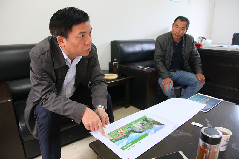 周董事長與官橋村委主任黃湯榮研究該村規劃設計方案